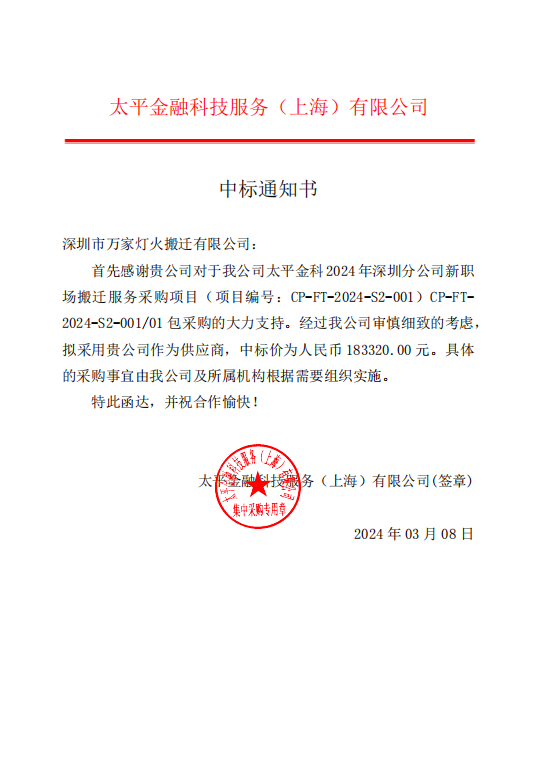 我司预祝本次的太平金融科技服务(上海)有限公司公司深圳分公司新职场搬家项目相助愉快。